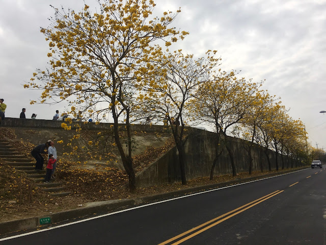 We initially didn't have plans to go out, but we ended up visiting my parents-in-law in Yunlin. Along the road from Huwei to Douliou (Hedi Road), we came across a long row of blooming trumpet trees. We took the opportunity to make a video and take some pictures, although the grey sky wasn't ideal for photography. There are two rows of trees, with the ones close to the road being yellow and the ones above being pink. However, the pink trees had very few flowers.