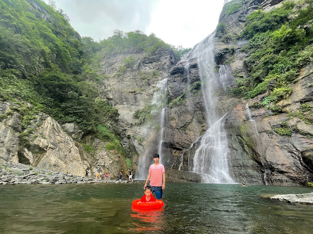 The car park at the entrance of the hiking trail could accommodate several cars, but it was already full. There was also a toilet, but it had a terrible odor and was infested with ants. The trail itself was not very challenging, about 500 meters long with an elevation gain of 70 meters. Our 4-year-old had no trouble walking, and we saw many older people enjoying the hike as well. It took us about 20-30 minutes to reach the waterfall. The waterfall was 40 meters tall and 10 meters wide, located at an elevation of 260 meters above sea level. The water was clean and free from pollution. Many people even brought bottles to collect some water. Personally, I found the water to be cold, so I didn't fully enjoy swimming, but our son had a great time playing in the waterfall's pool, despite shivering from the cold.
